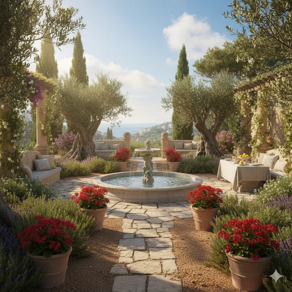 A stunning Mediterranean-inspired garden featuring drought-resistant plants, stone pathways, and elegant water features that create a serene outdoor retreat.