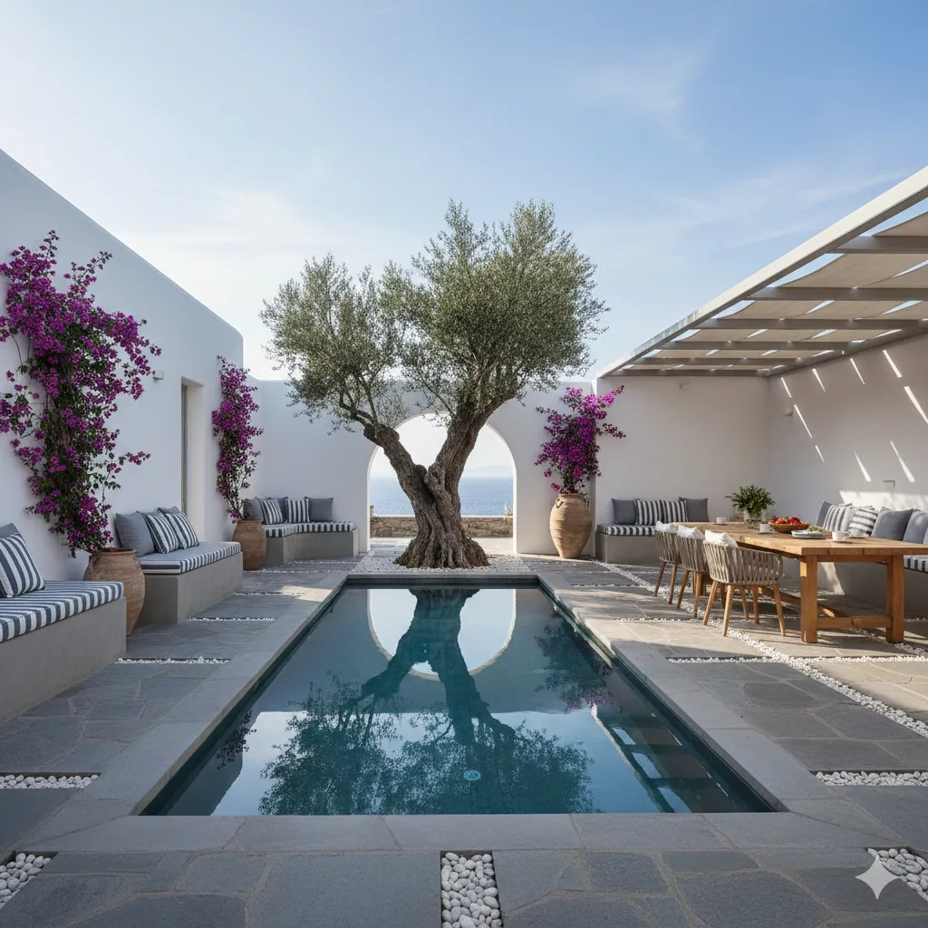 This contemporary courtyard design incorporates traditional Greek architectural elements with modern landscaping, creating a sophisticated outdoor living space.